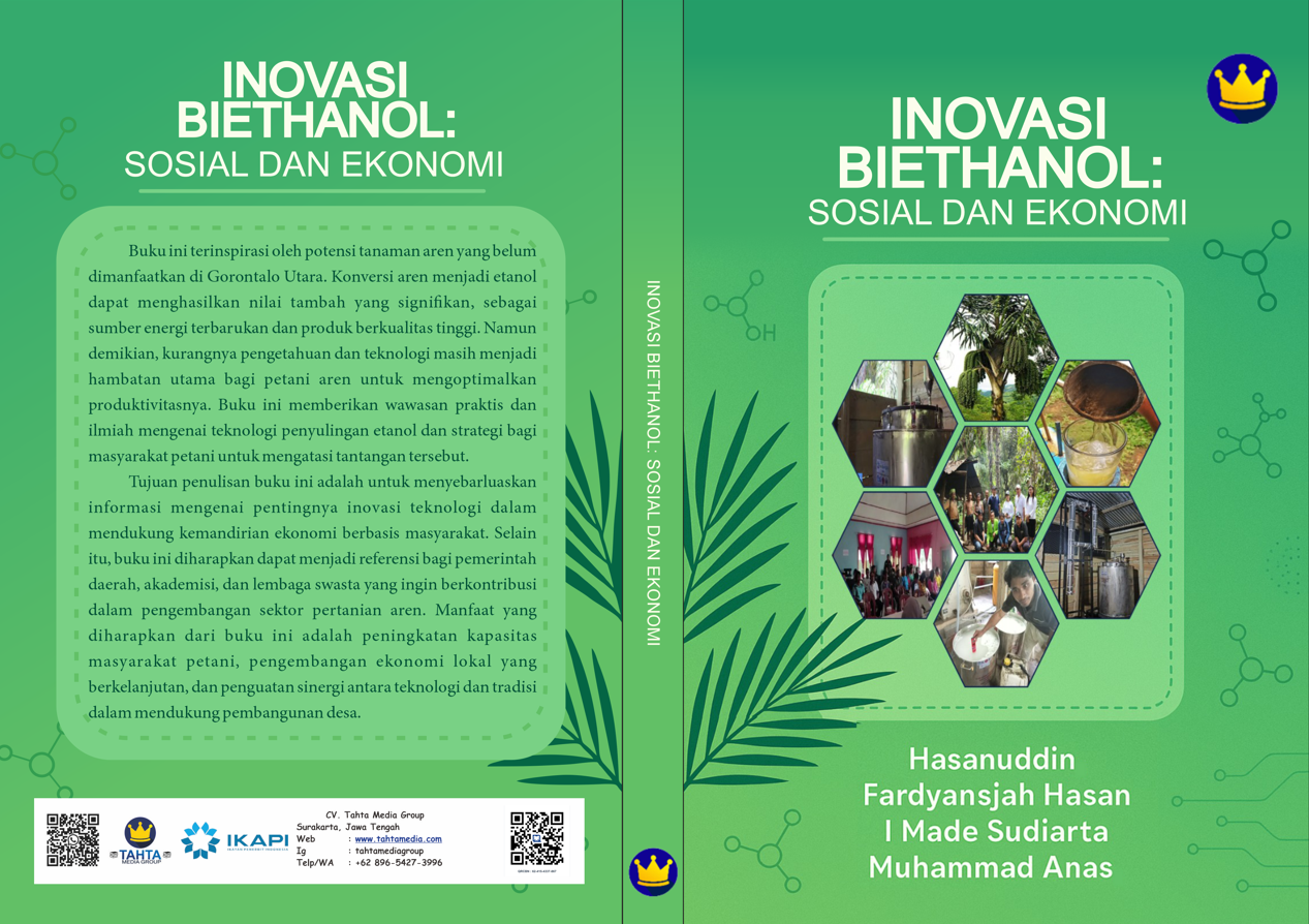 Tanaman aren merupakan salah satu sumber daya lokal Indonesia yang memiliki potensi besar namun belum dimanfaatkan secara optimal. Melalui penerapan inovasi teknologi destilasi bioetanol berkadar tinggi, aren dapat dikembangkan menjadi komoditas strategis yang mendukung kemandirian energi, peningkatan pendapatan masyarakat, serta penguatan ekonomi lokal yang berkelanjutan. Buku ini menguraikan keterkaitan antara aspek teknologi, sosial, dan ekonomi dalam pengembangan bioetanol berbasis aren, khususnya dalam konteks pemberdayaan masyarakat. Pembahasan dalam buku ini disusun secara sistematis, mencakup potensi sumber daya aren, teknologi destilasi bioetanol, strategi penguatan masyarakat, dampak sosial dan ekonomi, hingga tantangan serta peluang inovasi di masa depan. Dengan pendekatan yang integratif, buku ini diharapkan dapat menjadi referensi bagi pembaca dalam memahami peran inovasi teknologi sebagai penggerak transformasi sosial dan ekonomi berbasis sumber daya lokal.