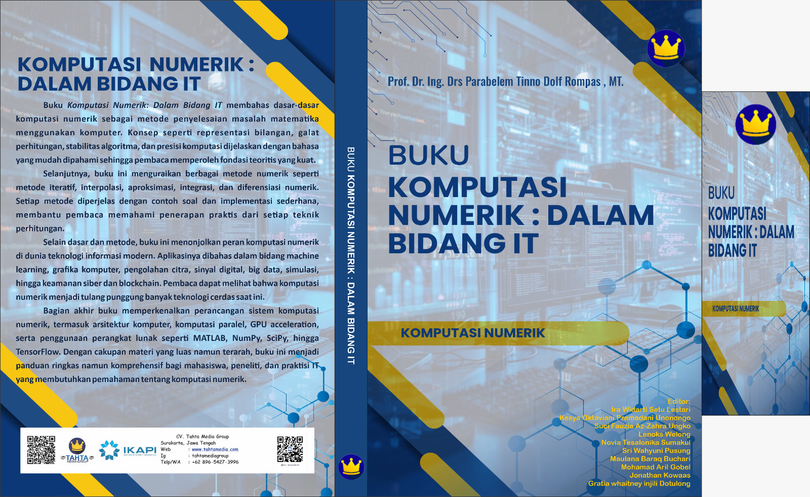 Isi buku ini disusun dalam enam bab utama. Bab pertama menghadirkan pengantar umum meliputi latar belakang, tujuan, ruang lingkup, dan sasaran pembaca. Bab kedua membahas dasar-dasar komputasi numerik, mulai dari definisi, perbedaannya dengan komputasi analitik, berbagai jenis kesalahan, hingga representasi bilangan dan peran algoritma. Bab ketiga mengulas algoritma numerik serta penerapannya, termasuk operasi aritmetika, metode iteratif, dan contoh penerapan pada machine learning, grafika komputer, pengolahan citra, dan simulasi sistem kompleks. Selanjutnya, bab keempat menyoroti peran komputasi numerik dalam dunia IT dengan menampilkan penerapan nyata di berbagai sektor. Bab kelima membahas perancangan sistem komputasi numerik, meliputi arsitektur komputer, komputasi paralel dan awan, optimasi algoritma, serta pemanfaatan perangkat lunak seperti MATLAB, NumPy, SciPy, dan TensorFlow. Bab terakhir menyajikan penutup yang berisi ringkasan umum serta arahan pengembangan lebih lanjut, menegaskan kembali posisi komputasi numerik sebagai fondasi penting dalam kemajuan teknologi informasi.